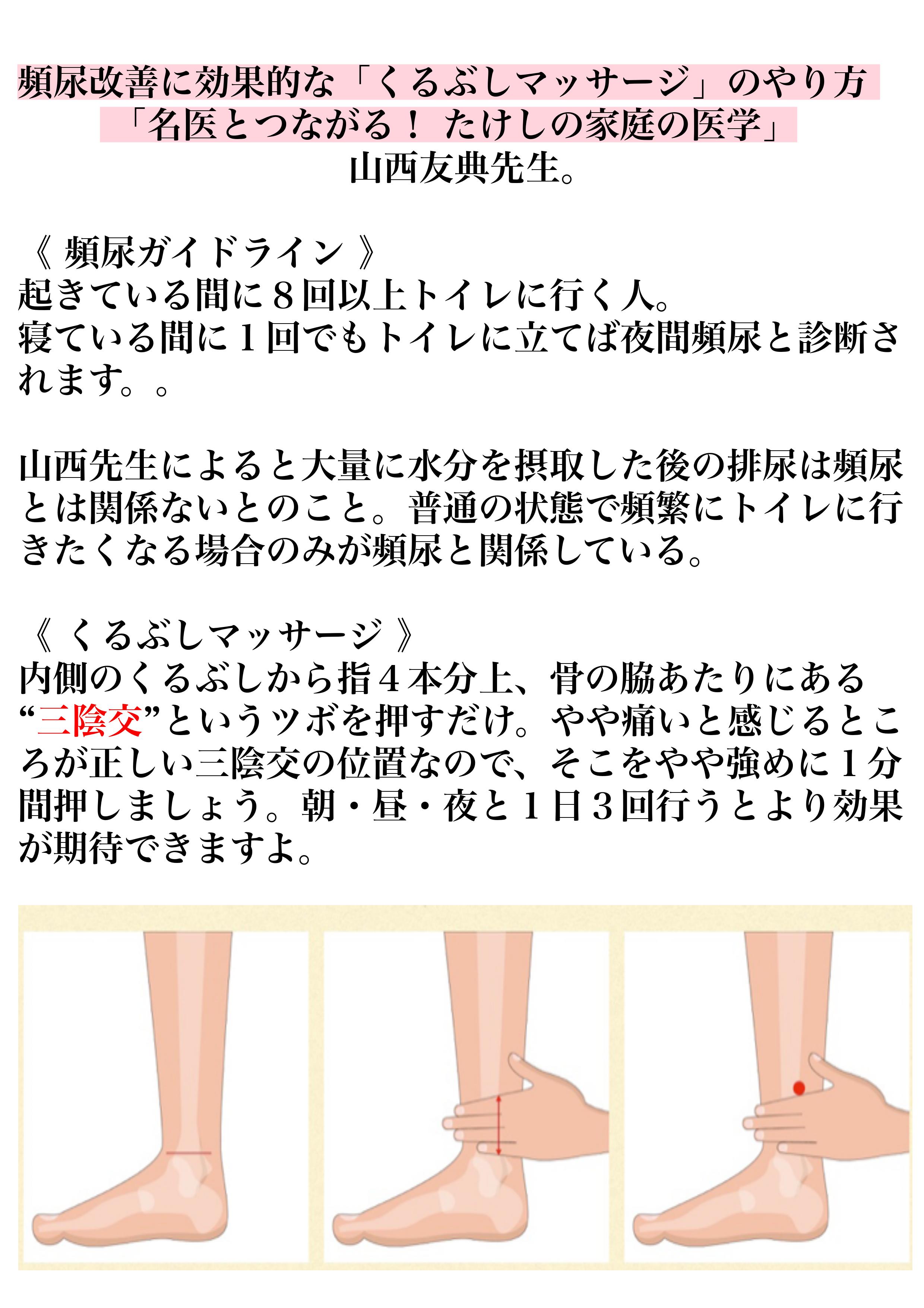 そもそも加齢による頻尿は膀胱まわりにある神経の誤作動が原因。膀胱まわりの神経はとても長く、足の裏まで つながっています。くるぶしあたりの神経は体の表面近くを通っているので、刺激を与えるには最適の場所。マッサージで刺激することによって、膀胱の誤作動を抑えられる可能性が高いそうです。