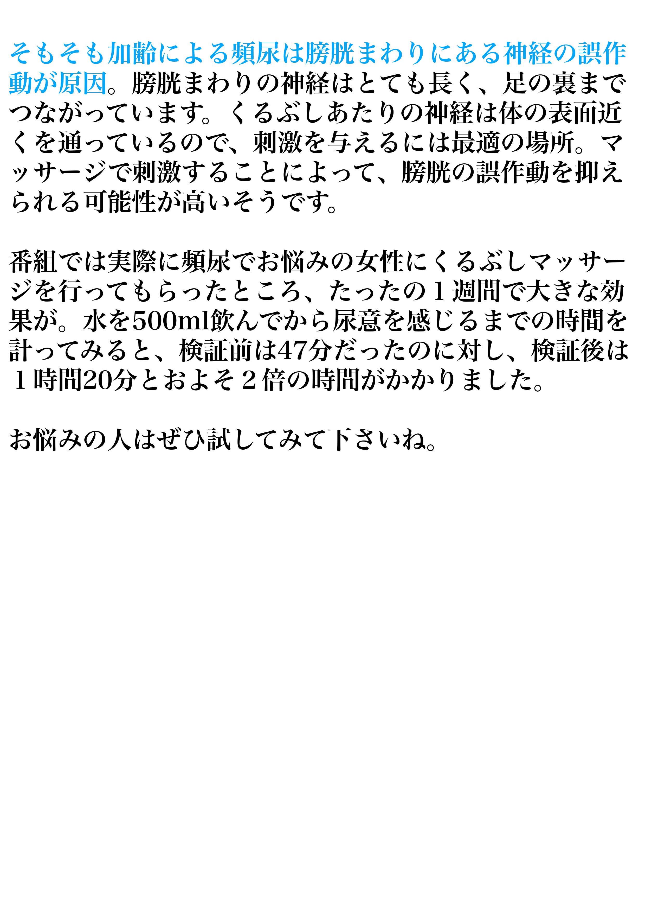 番組では実際に頻尿でお悩みの女性にくるぶしマッサージを行ってもらったところ、たったの1週間で大きな効果が。 水を500ml飲んでから尿意を感じるまでの時間を計ってみると、検証前は47分だったのに対し、検証後は1時間20分とおよそ2倍の時間がかかりました。