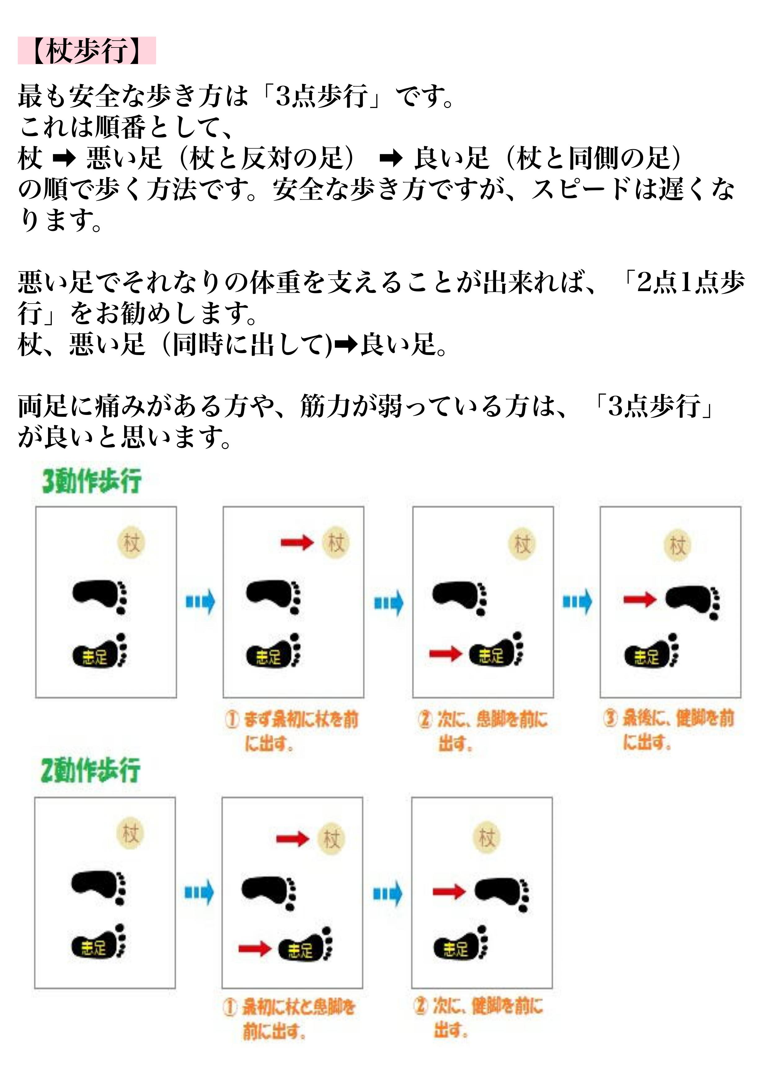 両足に痛みがある方や、筋力が弱っている方は、「3点歩行」が良いと思います。