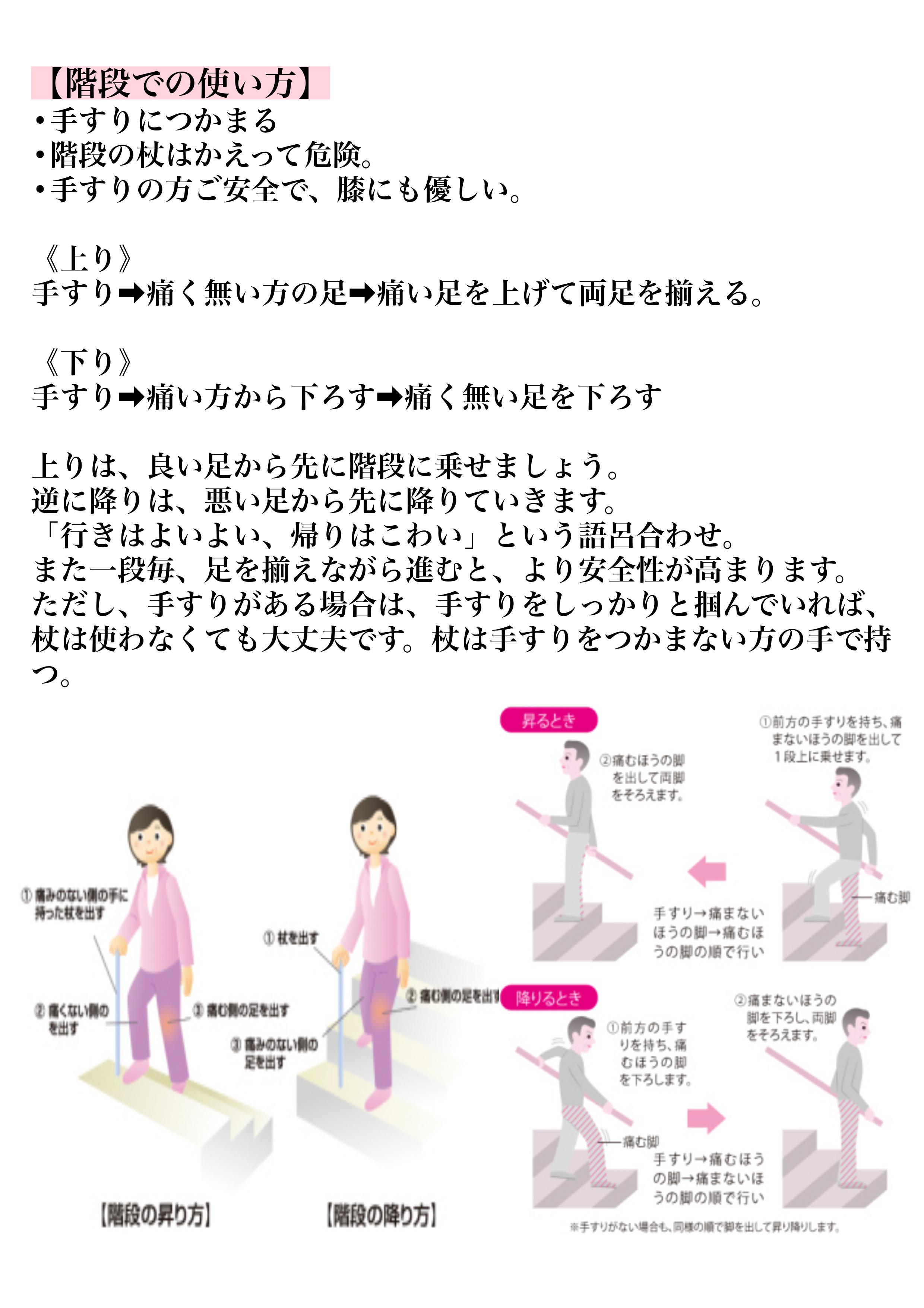 ただし、手すりがある場合は、手すりをしっかりと掴んでいれば、杖は使わなくても大丈夫です。