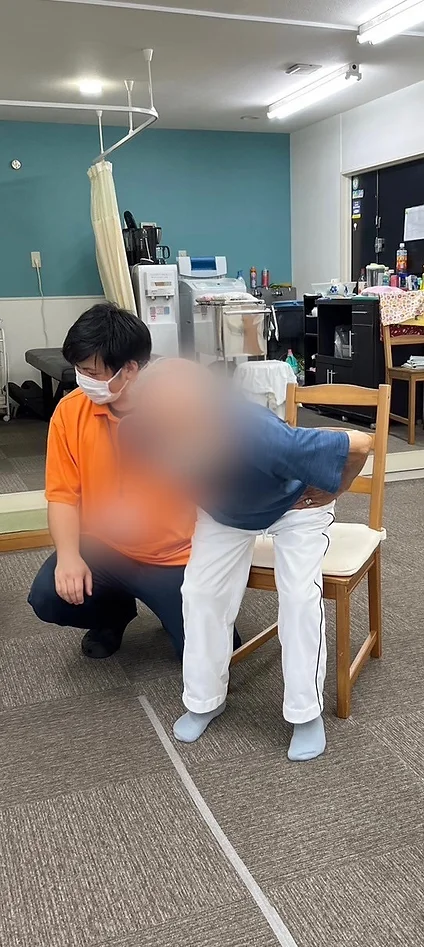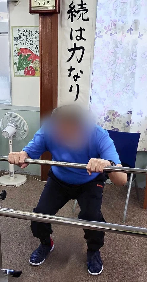 歩行訓練だけでは転倒を完全に予防は出来ません。 そのため行うのが… 立ち座り訓練(正しく行うスクワット)です。 スクワットで下肢筋力をつけることにより、ふらつきのない立位維持ができるようになります。 |